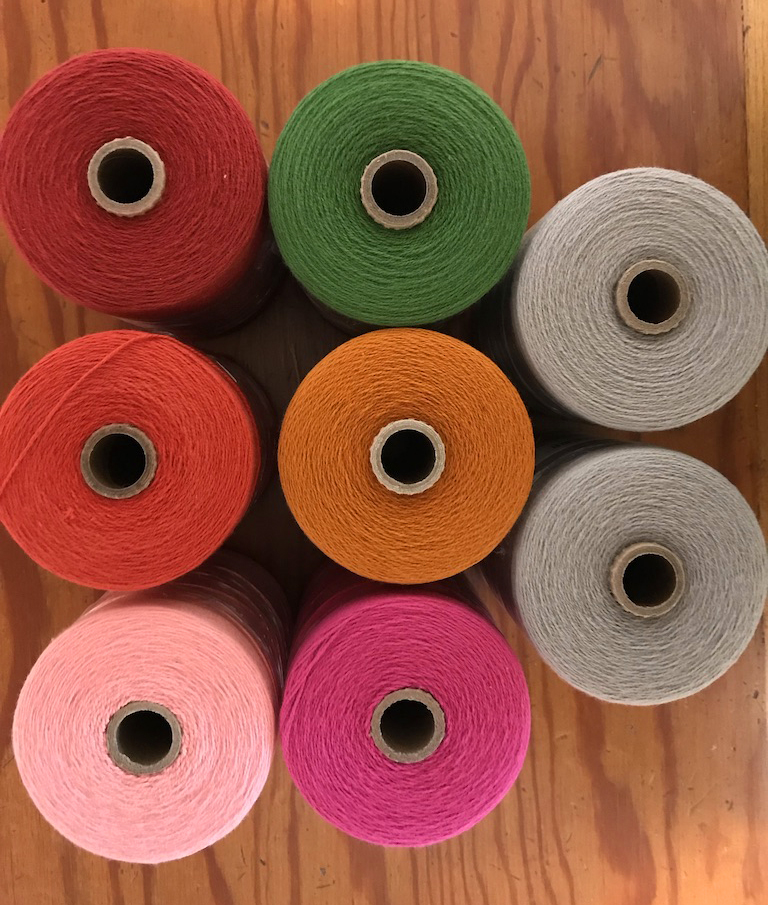 If you start deep diving into the whole Pantone color thing, you can find web sites that take the current Color and create palettes with coordinating hues. I chose a few colors, and then tried to match them with available 8/2 cotton colors from Maurice Brassard. That seemed to work pretty well.