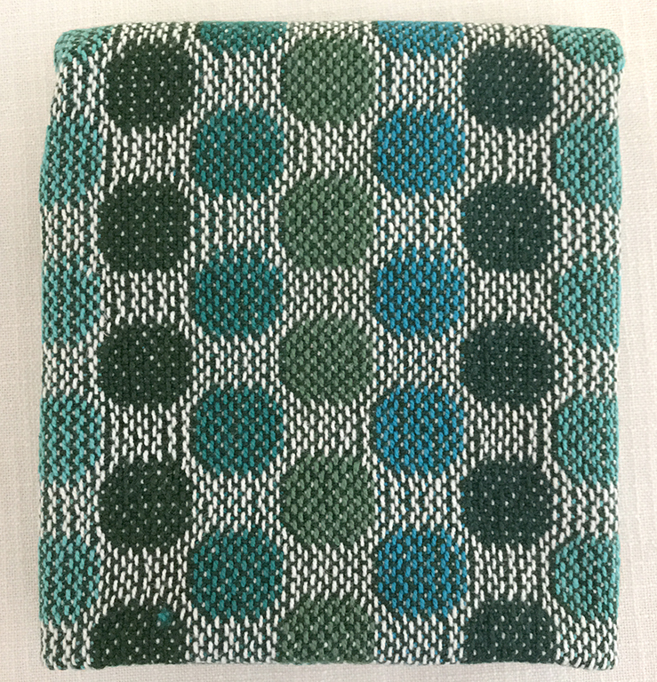 I wove these towels in 8/2 unmercerized cotton sett at 24 ends per inch. As you know, Turned Taqueté structure alternates dark and light threads to create the design. I used navy as the dark option, and a selection of blues and green for the light option.