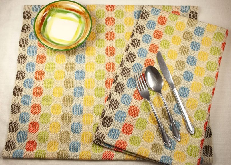 Yesterday I launched a new direction for my weaving. I posted downloadable PDF directions and the WIF file for Turned Taqueté Circles Placemats in my Etsy shop. The pattern is written for 5/2 perle cotton with suggestions for two different color palettes, the Blues pictured above, and for Mid-Century Modern colors.
