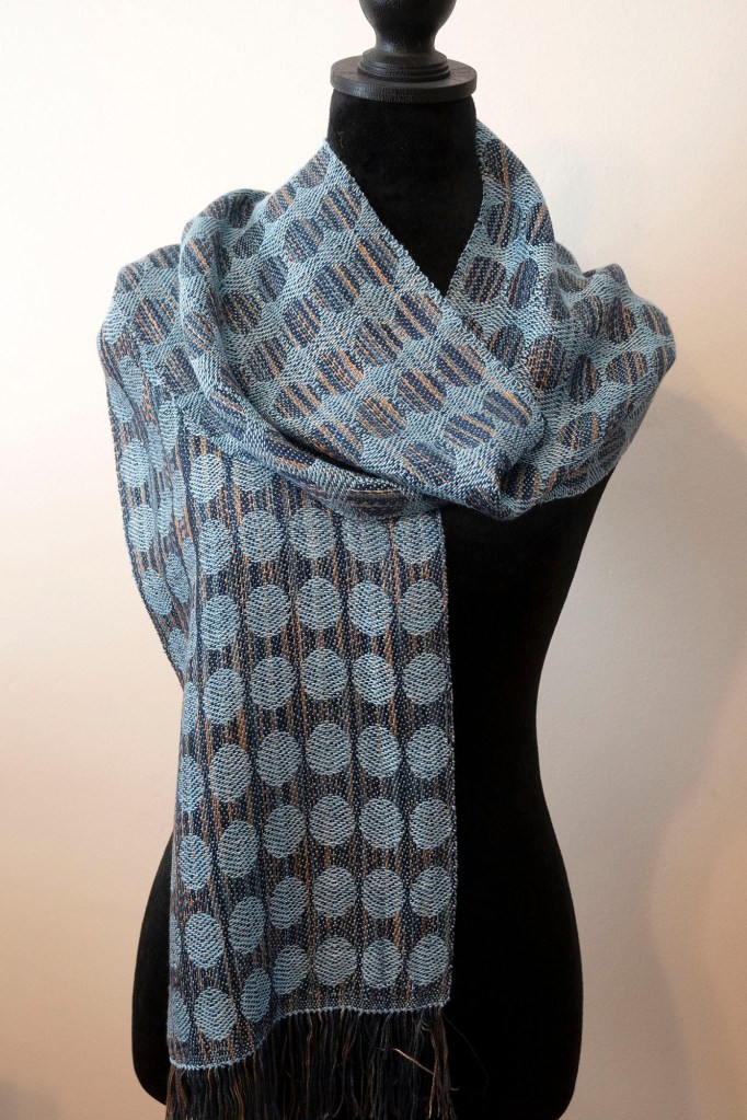 I published two scarves in Handwoven Magazine, one in May/June 2012 and one in May/June 2013, using Diversified Plain Weave (look them up!) One of the scarves was a circles scarf, and I thought I would like to rework that design into rows of offset circles. And this is what I came up with.