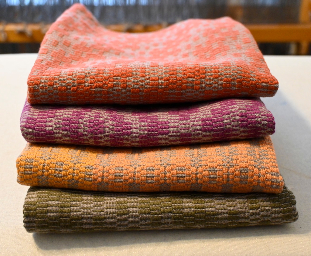 I tried two different versions with yarn sizes. The yellow and the orange are 16/2 unmercerized cotton (yellow) and 8/2 unmercerized cotton (light variegated) warps with 16/2 unmercerized cotton weft. By the time I got to the end of the orange one I was ready to tear my hair out. Much too slow! So, for the blue and the green one I used 8/2 unmercerized cotton weft. This time the weaving time was much more acceptable. For all the sett was 24 epi.