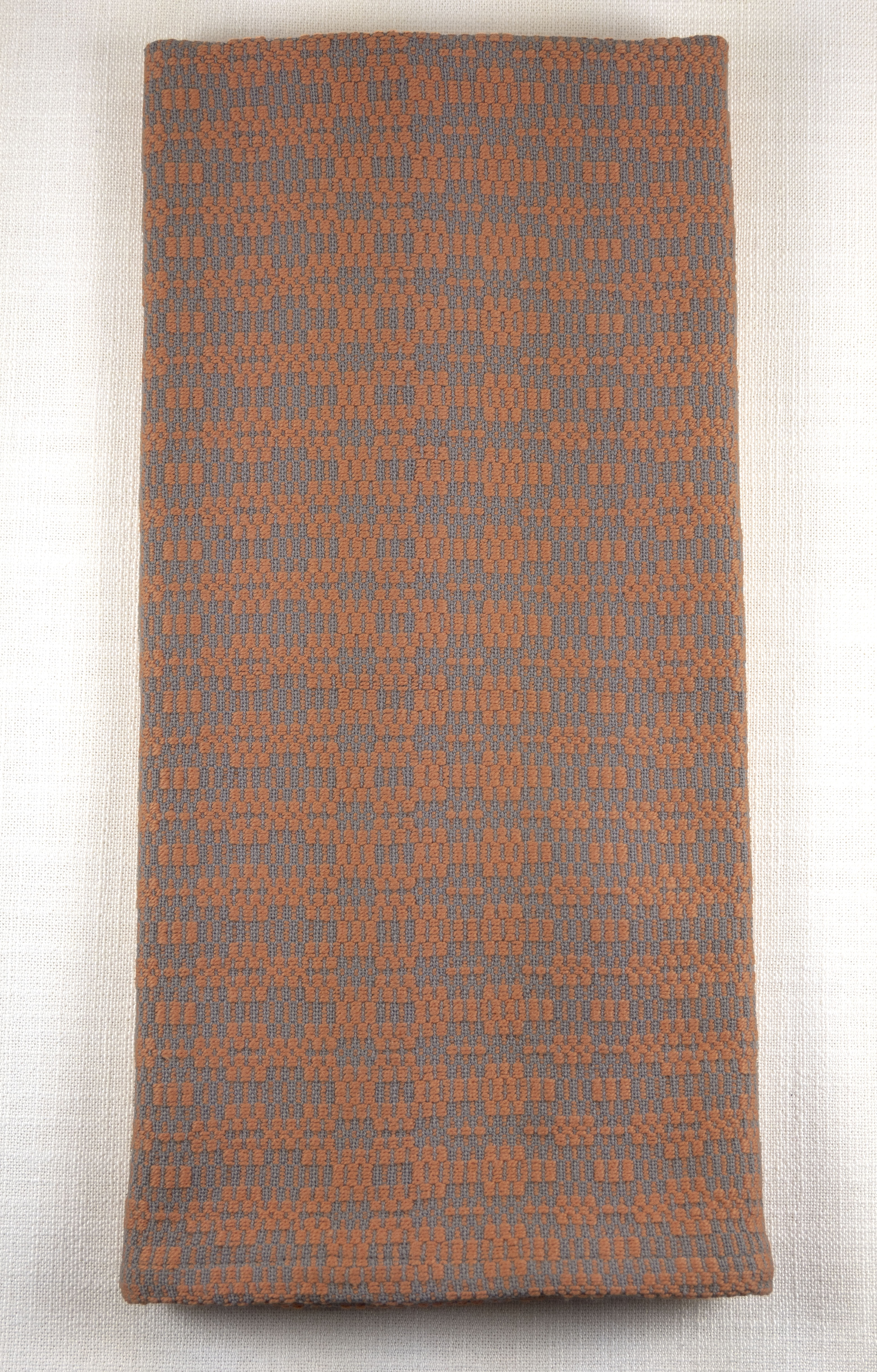 This is a handwoven towel in 100% cotton. The design is the Rhythm Crackle pattern that I sell on Etsy. It is a combination of a soft gray background warp and rust orange pattern. My towels are sturdy and easy to care for. This towel can be machine washed on cold and either machine or line dried. It measures 26.5″ x 17.5″ with machine sewn hems. Free shipping, United States only, please.
