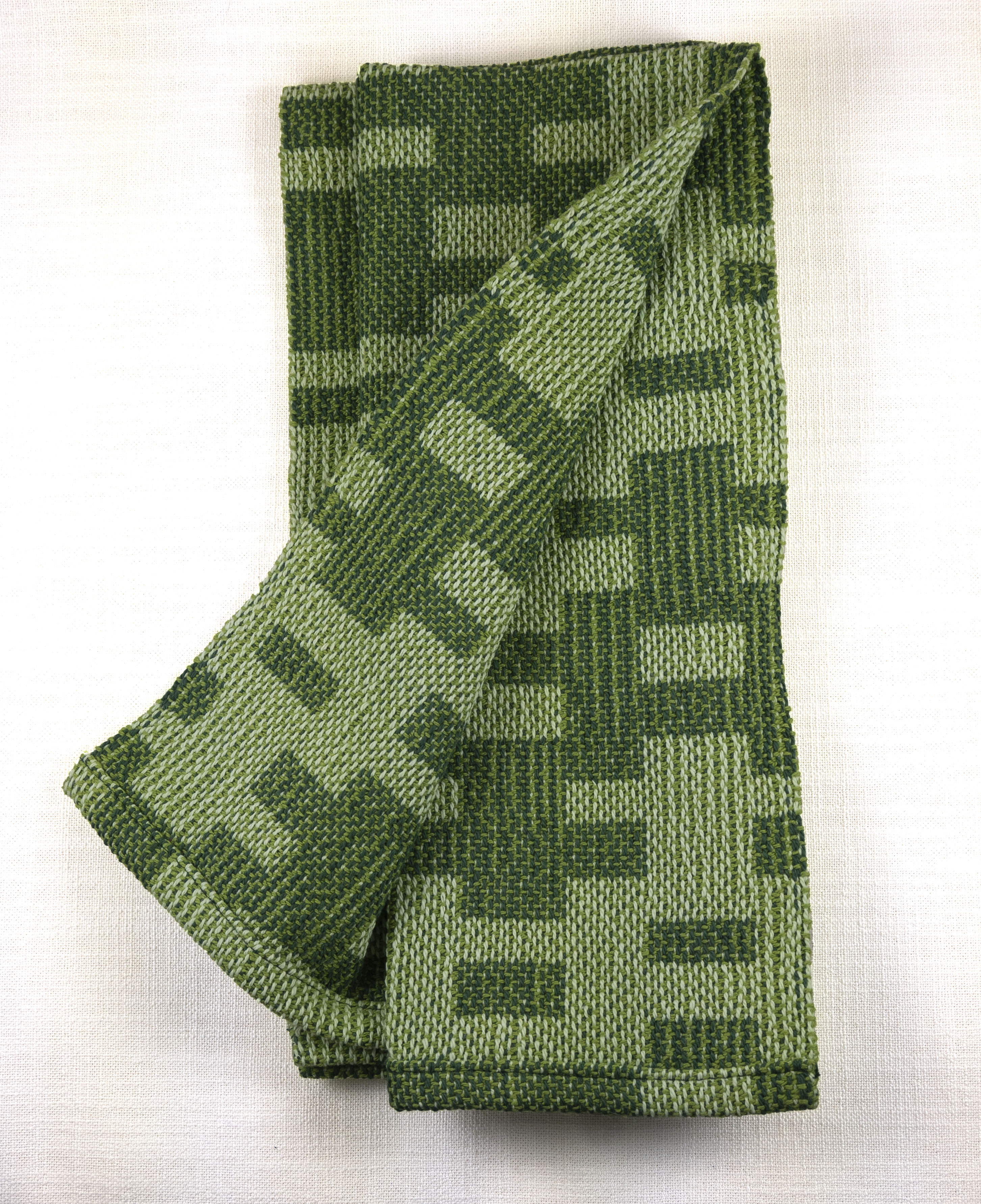 There are 2 of this color towel. This is a handwoven towel woven by me in 100% cotton. The design is the Rhythm Crackle pattern that I sell on Etsy. It is a combination of a soft variegated background warp and dark green pattern. This towel is a heavy weight. My towels are sturdy and easy to care for. This towel can be machine washed on cold and either machine or line dried. It measures 25.5″ x 19″ with machine sewn hems. Free shipping, United States only, please.
