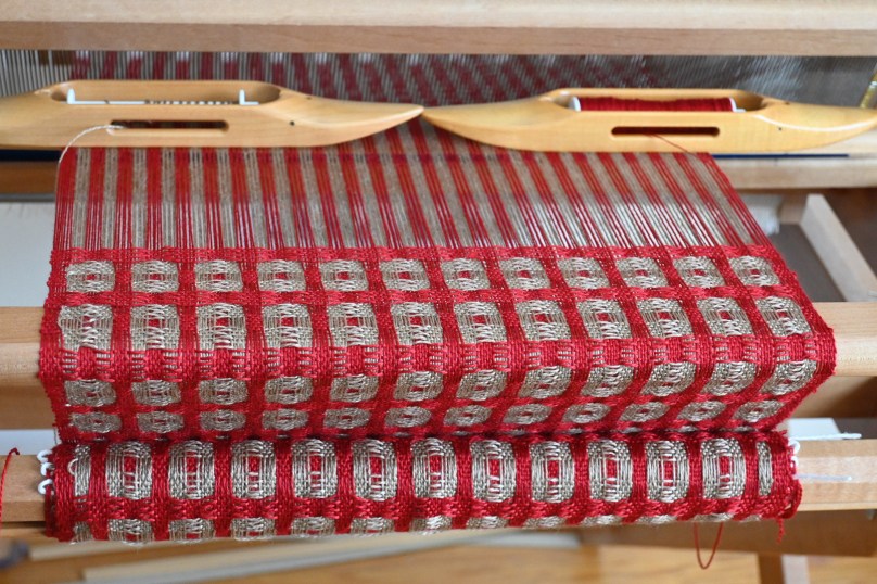 I starting planning this project in July, I think. This is 6 harness Deflected Double Weave in the pattern Deflect Circles by Janet Phillips. I found it in the first issue of Weft Magazine (highly recommend!), and thought to myself that I should finally try this technique.