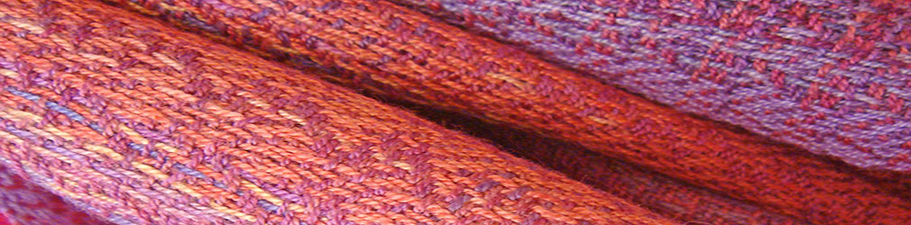 I start by winding off 4 ounce skeins of yarn. I usually wind off three at a time, because that’s how much room I have on my painting surface. I use 8/2 Tencel from Maurice Brassard Yarns. (I buy this yarn from the Woolery in Frankfort, KY) It comes in 8 oz. tubes. I put a tube on a digital scale on the floor, and wind from that on to an umbrella swift. The swift is opened up quite wide. My skeins measure roughly 93-94″ around. When the scale says I have wound off 4 ounces I stop and tie the ends together. I also tie the skein in four places (not too tight!) to keep the threads from shifting around too much.
