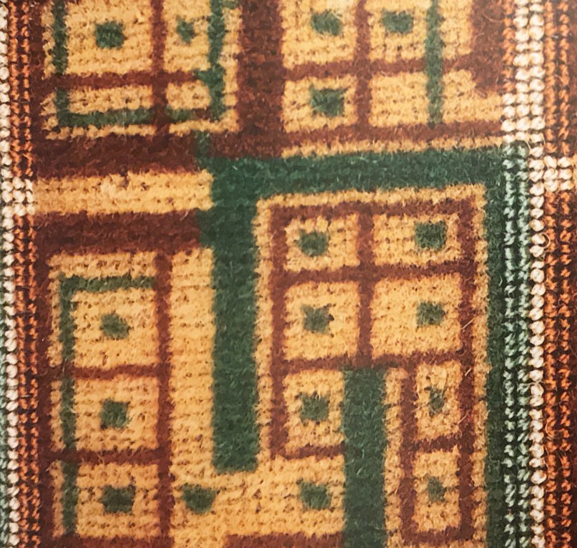 Moquette is French for carpet, woven of wool with cotton backing and tufted, with either loops or cut pile or a combination. Moquette is used on London’s transport (tubes, buses, trams) seats. LT requires that moquette be patterned, partly for decorative effect, but also because the patterns hide dirt. Four colors are used, but the effects of cut and uncut pile make it feel like more. The pile is warm and comfortable in winter, cool in summer, and makes for an inviting tube or bus ride where one would otherwise feel bored, crowded, and miserable.