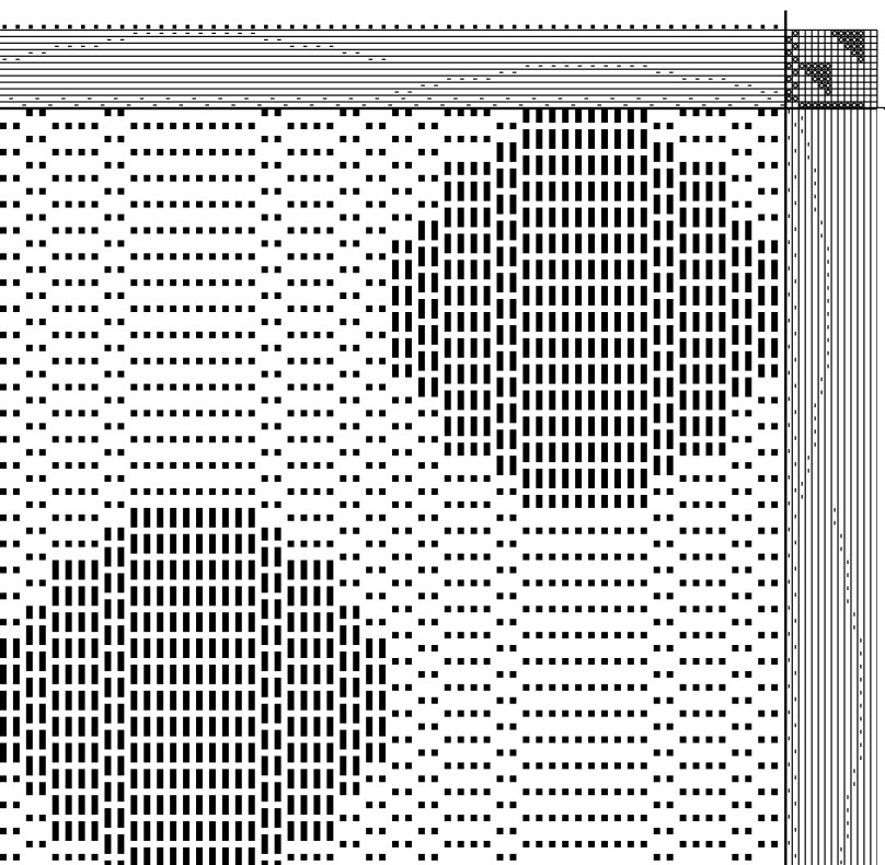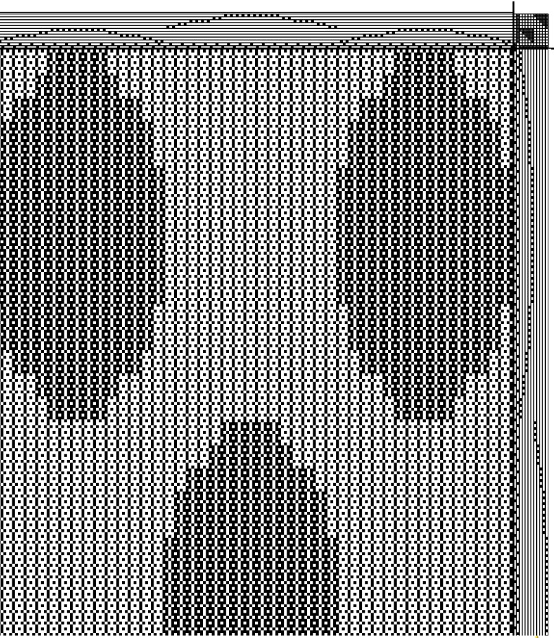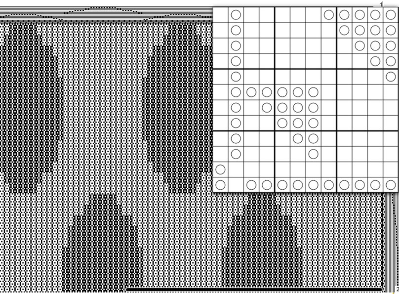 The weaving program will turn the draft for you, resulting in the following. I know this is very tiny so I’ll just tell you that when turned, the draft morphs to 22 harnesses. Too many for me! (Again adjustments to the treadling might have to be made, this time to lengthen the ovals.)